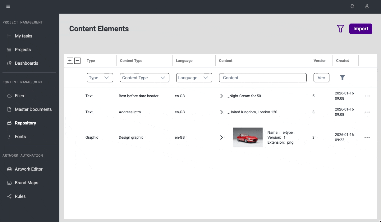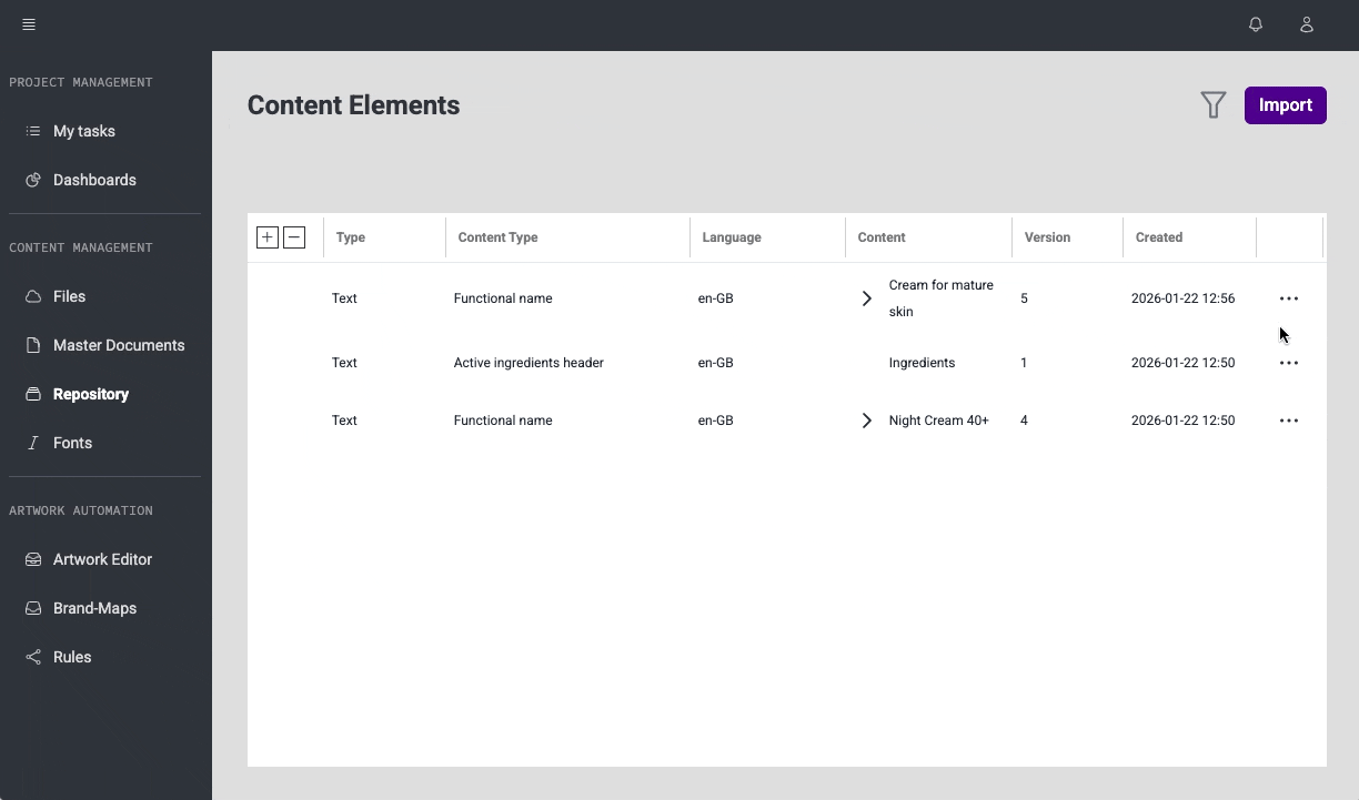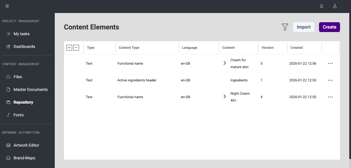 Enables creating new Content Elements and editing existing ones directly from Repository pages, using the same editing experience as on Master Document details.